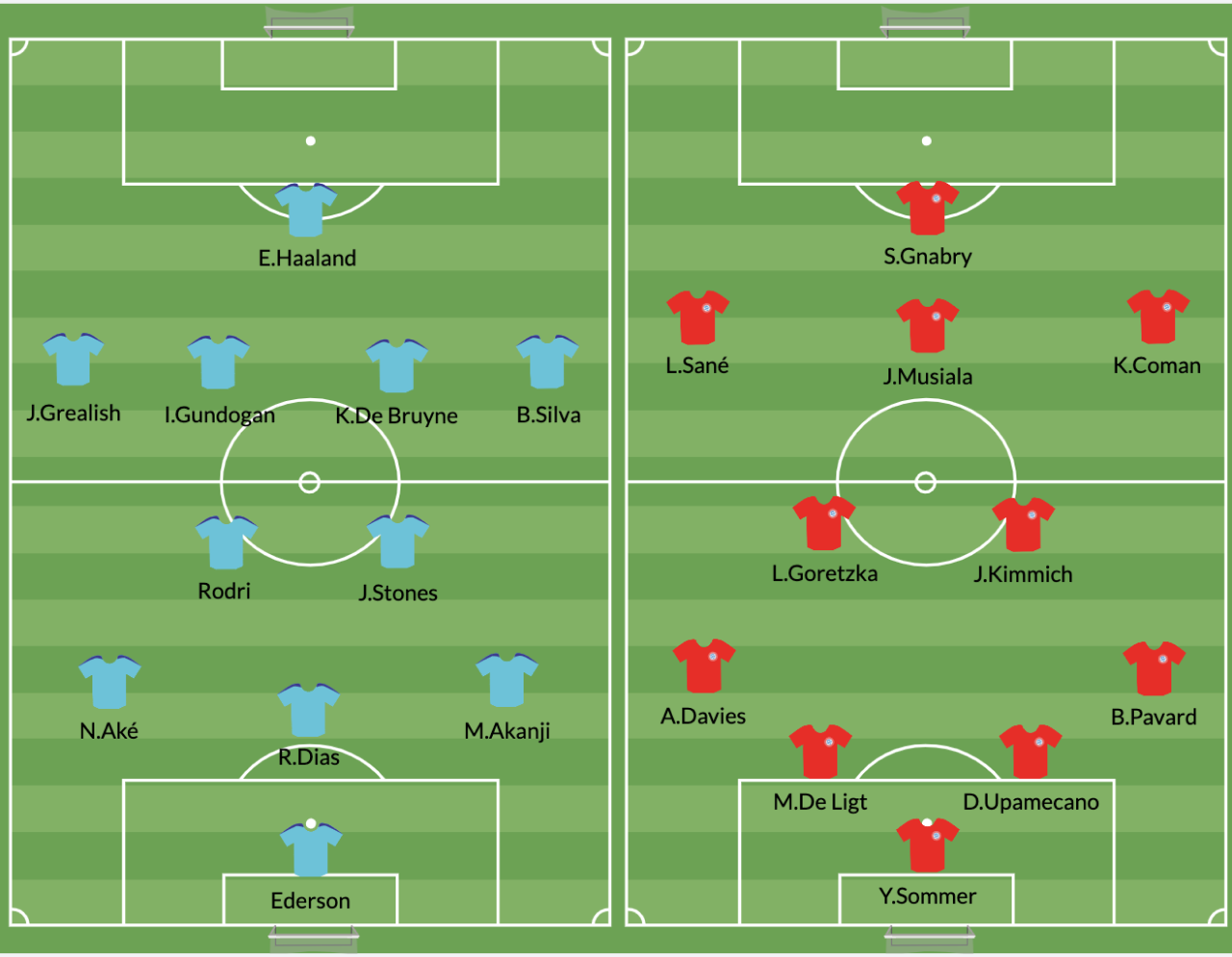 Cependant, il aura fallu se réajuster par moment pour contrer les montées offensives de A.Davies et le passage à 3 par séquence de la défense munichoise. Heureusement pour P.Guardiola, ces joueurs sont assez intelligents pour répondre facilement à ce genre de variante afin de s’adapter à la dynamique de match. J.Stones ou R.Dias n’hésitent pas à suivre les décrochages des joueurs munichois, J.Musiala ou S.Gnabry, afin suivre le pressing instauré par les offensifs Cityzens.