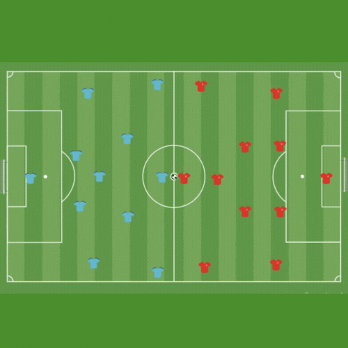 Le circuit préférentiel est alors un redoublement de passe en ces 5 joueurs défensifs puis lorsque l’espace est créé, un changement de rythme pour une passe cassant une ligne vers un des 5 offensifs.