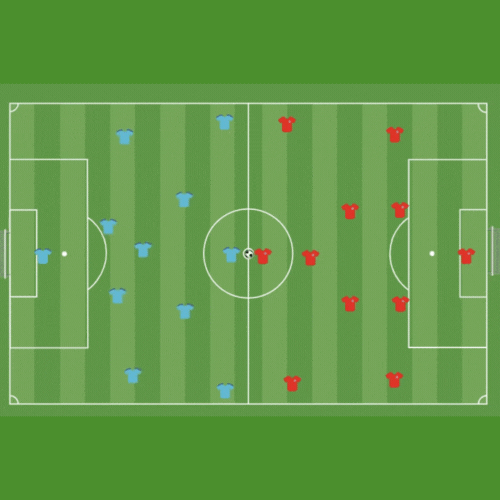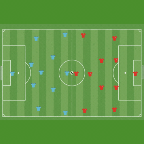 J.Stones vient se placer au côté de Rodri en tant que milieu défensif afin de participer à la relance des Cityzens. Cette incorporation de J.Stones au sein du milieu de terrain permet de créer une supériorité numérique dans ce compartiment du jeu. La relance est alors facilitée par l’augmentation des options disponible lors de la relance.