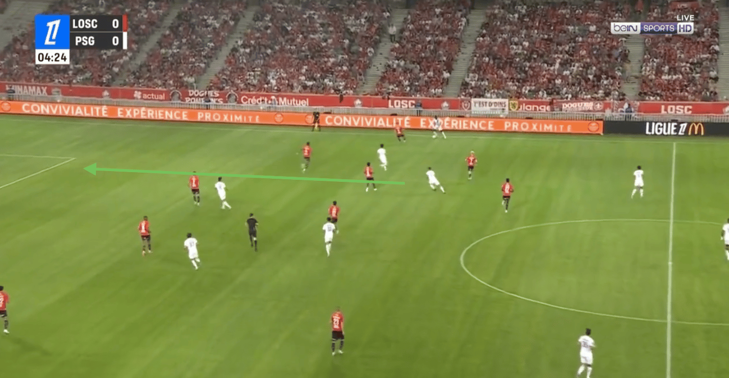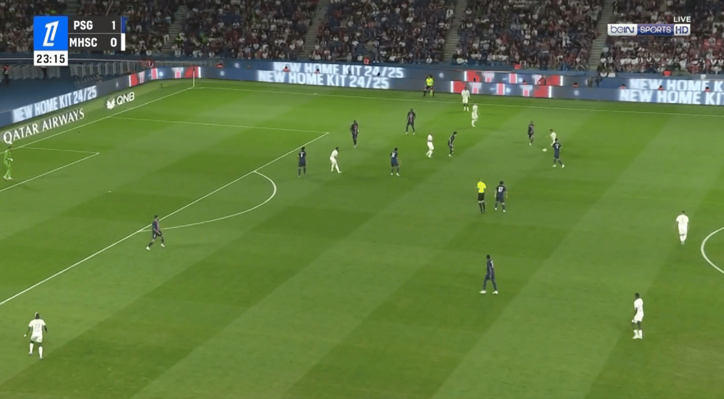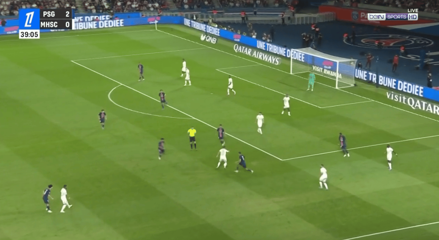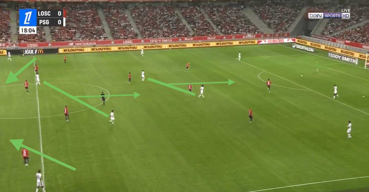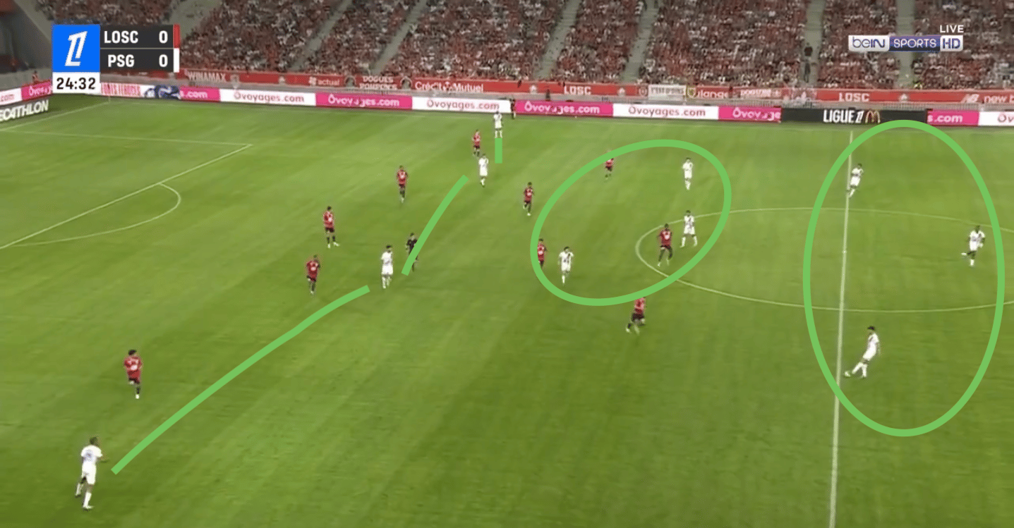 Le PSG peut alors se retrouver en danger sur des transitions rapides, surtout avec des ballons dans le dos des défenseurs centraux excentrés.
