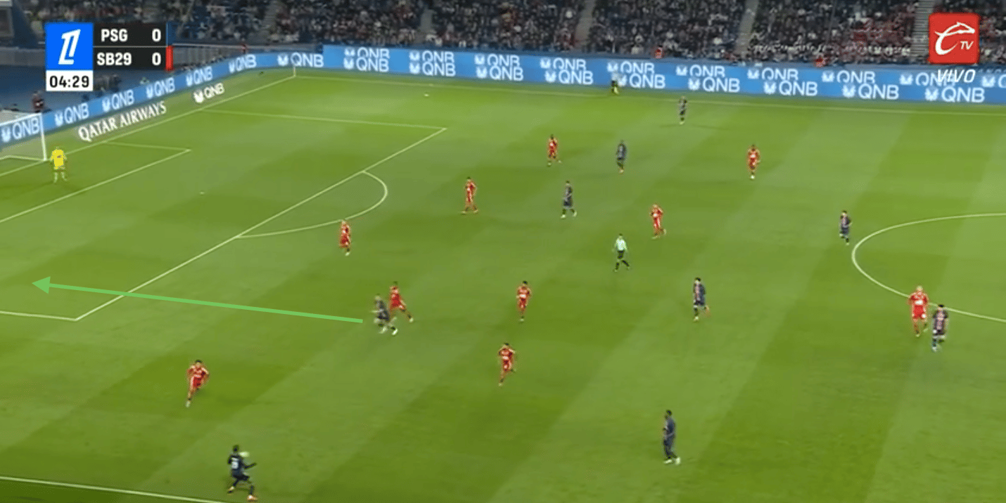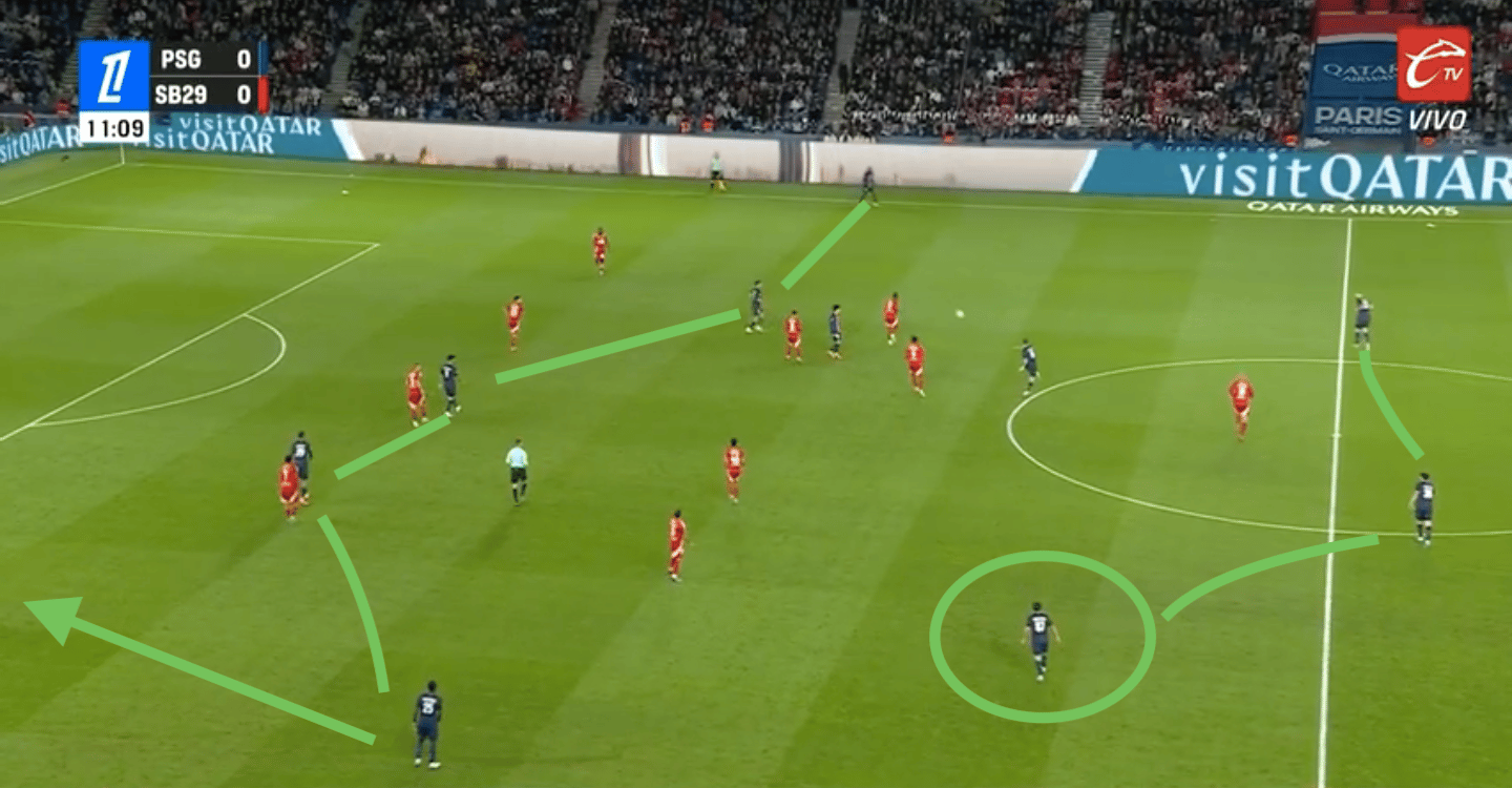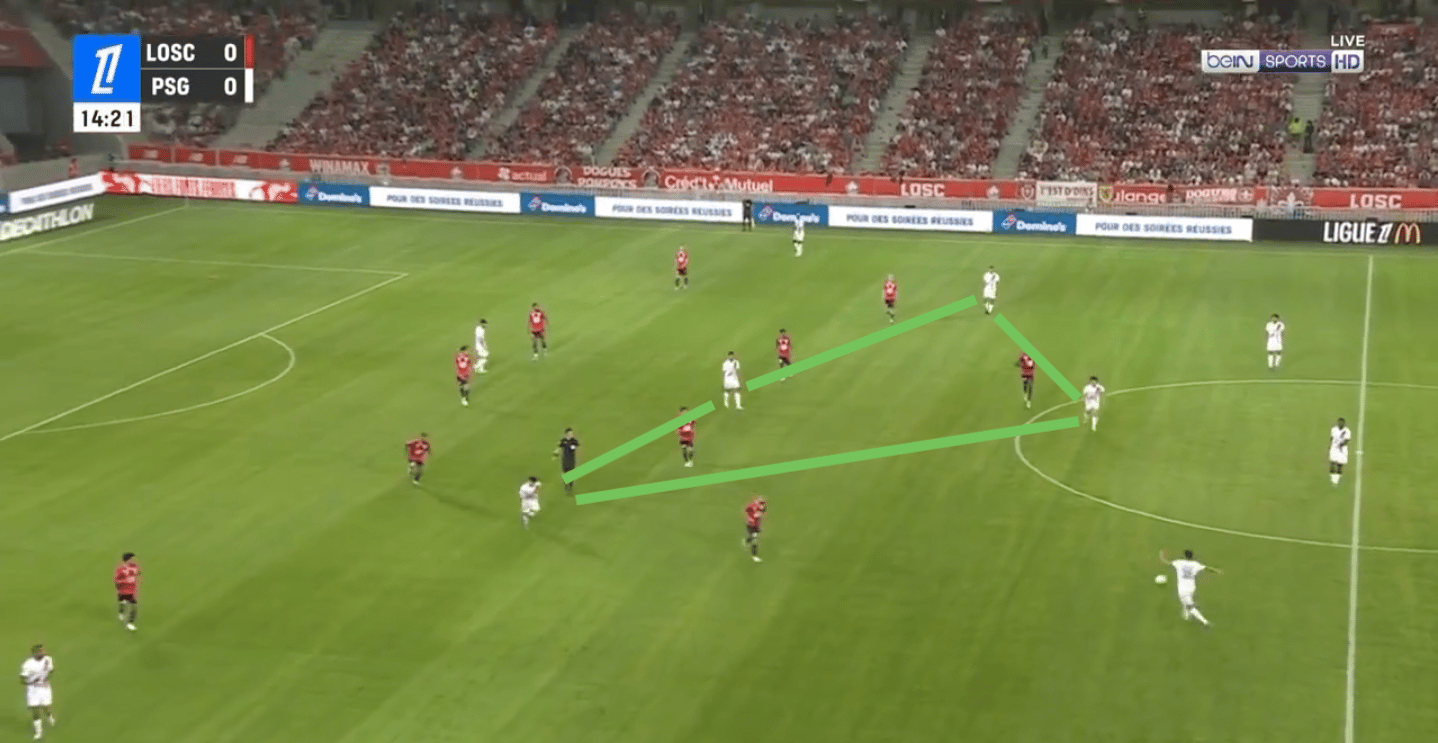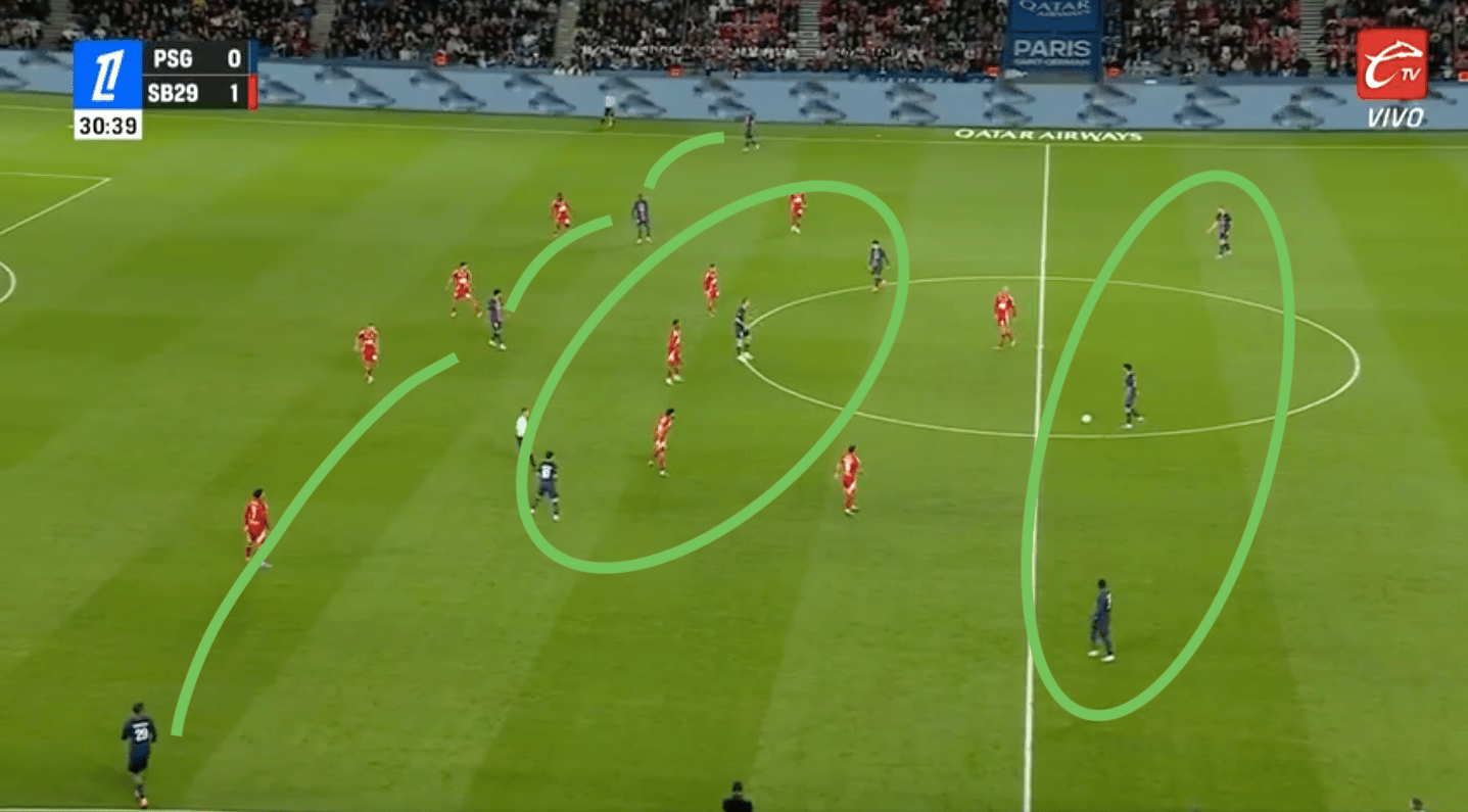 Le PSG peut alors se retrouver en danger sur des transitions rapides, surtout avec des ballons dans le dos des défenseurs centraux excentrés.