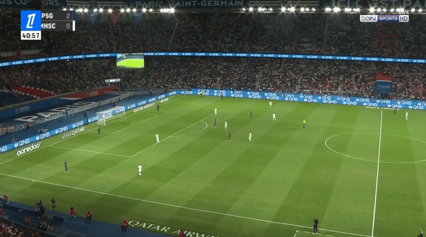 Grosse densité à l’intérieur et un bloc équipe compact ici ou l’on voit les 11 joueurs parisiens.