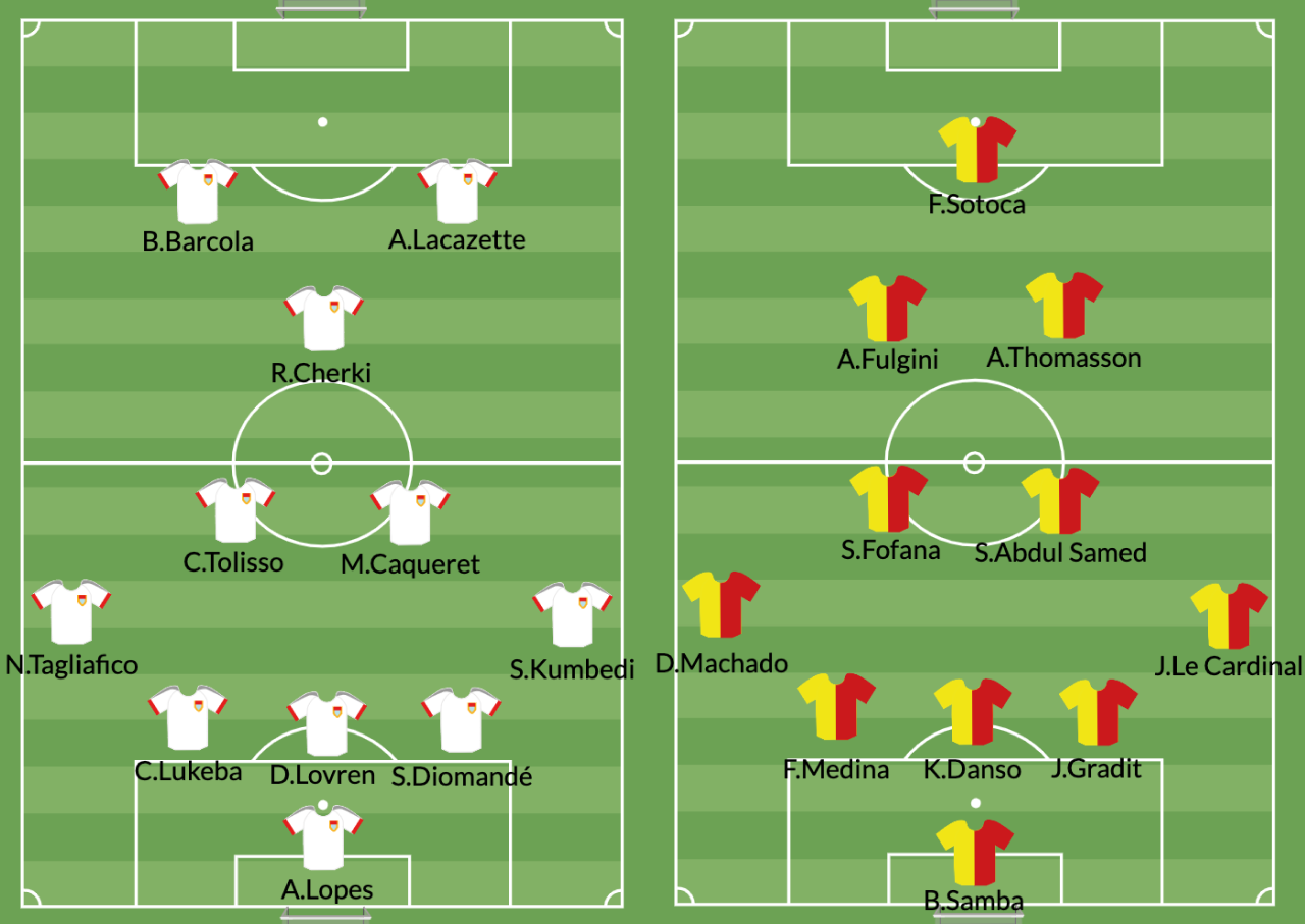 Coté Lyonnais, 3-4-1-2 choisi par L.Blanc pour répondre au schéma Lensois mais aussi car il possède les atouts pour jouer dans cette formation. R.Cherki occupera le poste de numéro 10. B.Barcola et A.Lacazette occuperont l'attaque lyonnaise. C.Lukeba retrouve du temps de jeu au poste de défenseur central gauche.
