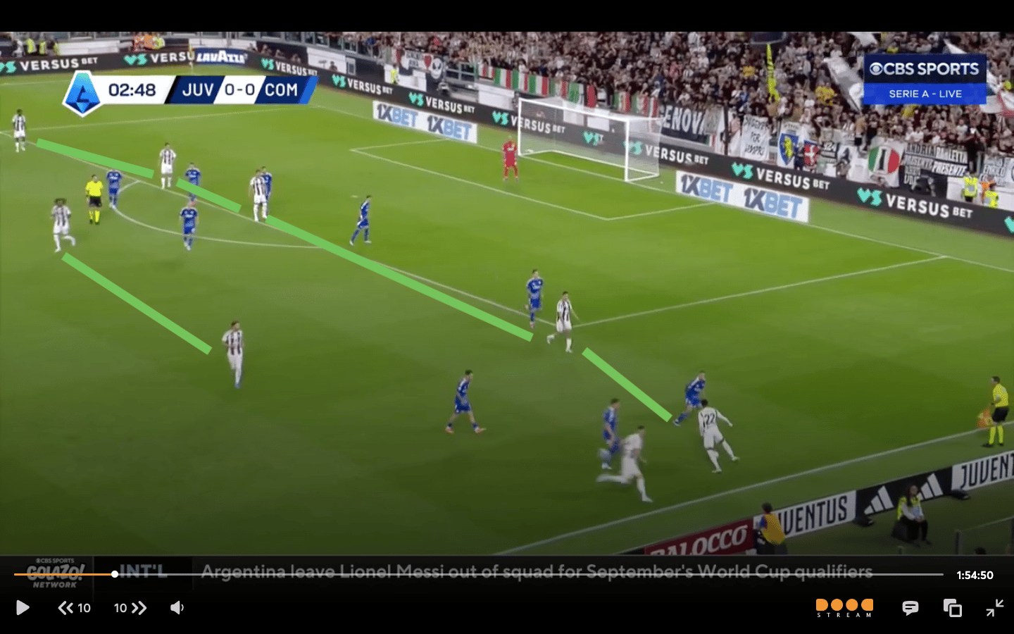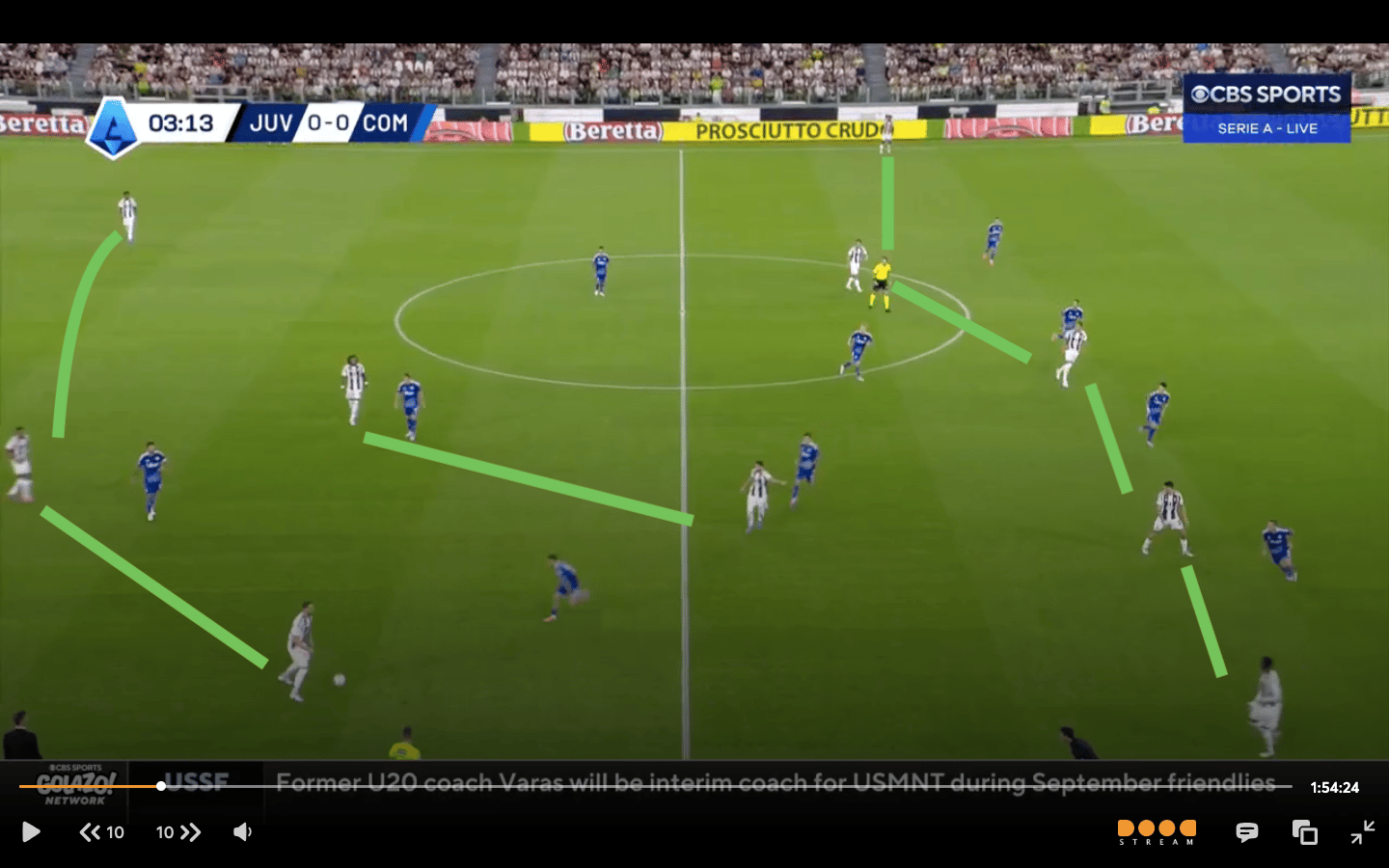 Sur cette image, c’est le latéral Cambiaso qui vient s’insérer dans le demi-espace entre Weah et Vlahovic au poste de 10.