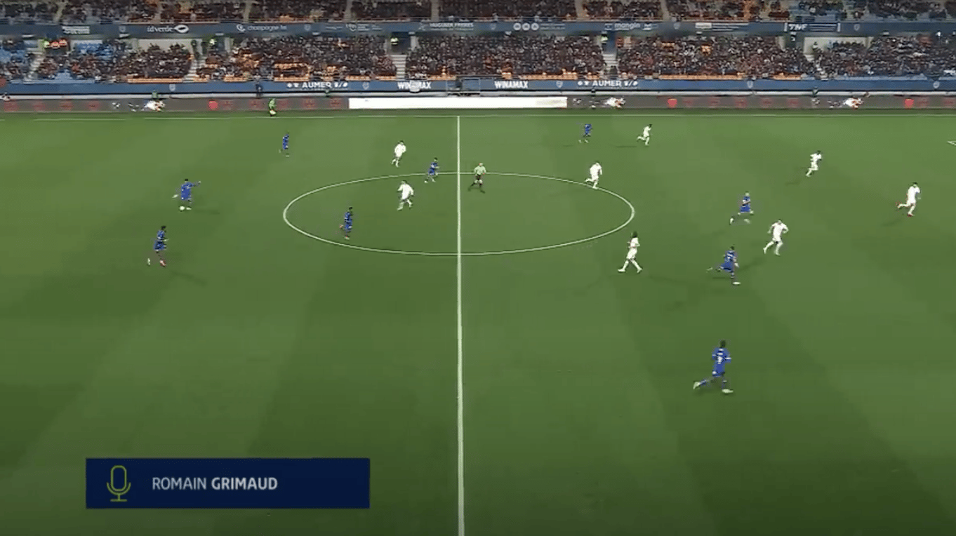 Représentant bien les idées de T.Motta, on peut voir en bas de l’écran le défenseur central Gatti dédoublé derrière son ailier !