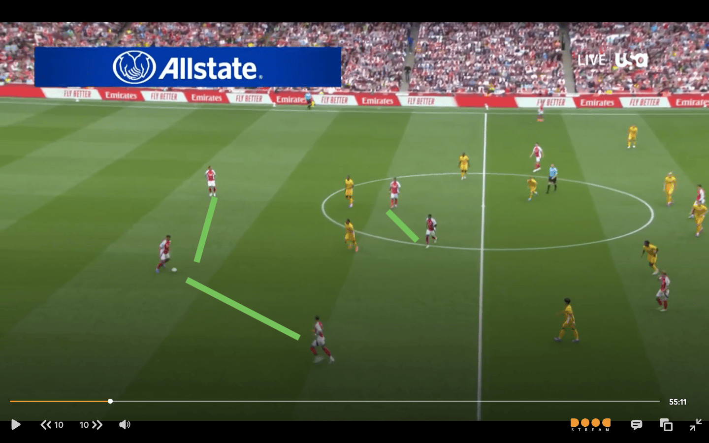 Relance à 3 avec Timber qui vient faire le double pivot depuis un poste de latéral gauche. Ben White, latéral droit, vient former la défense à 3.
