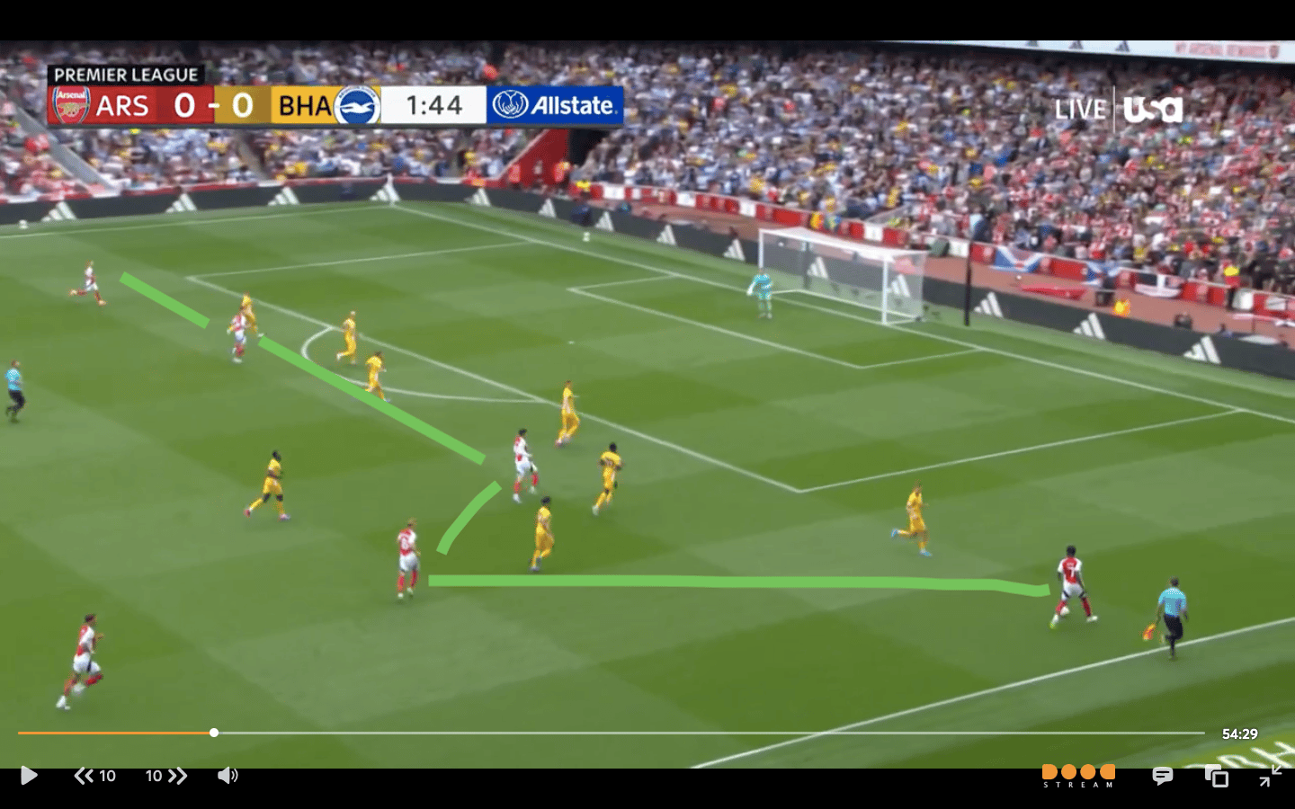 Ligne de 5 offensifs, avec des ailiers aux pieds inversés. Assez surprenant de voir Rice venir s’insérer au sein de cette ligne entre Havertz et Trossard.