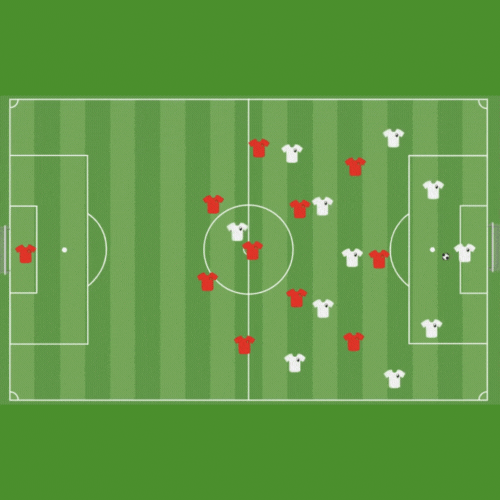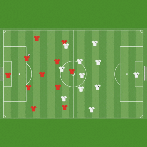Cependant, ce n’est pas toujours le cas. Dans certaines situations de dégagement de la part des Gunners, les Magpies tentent de casser la sortie du bloc adverse par une passe rapide au sein de la défense Gunners.