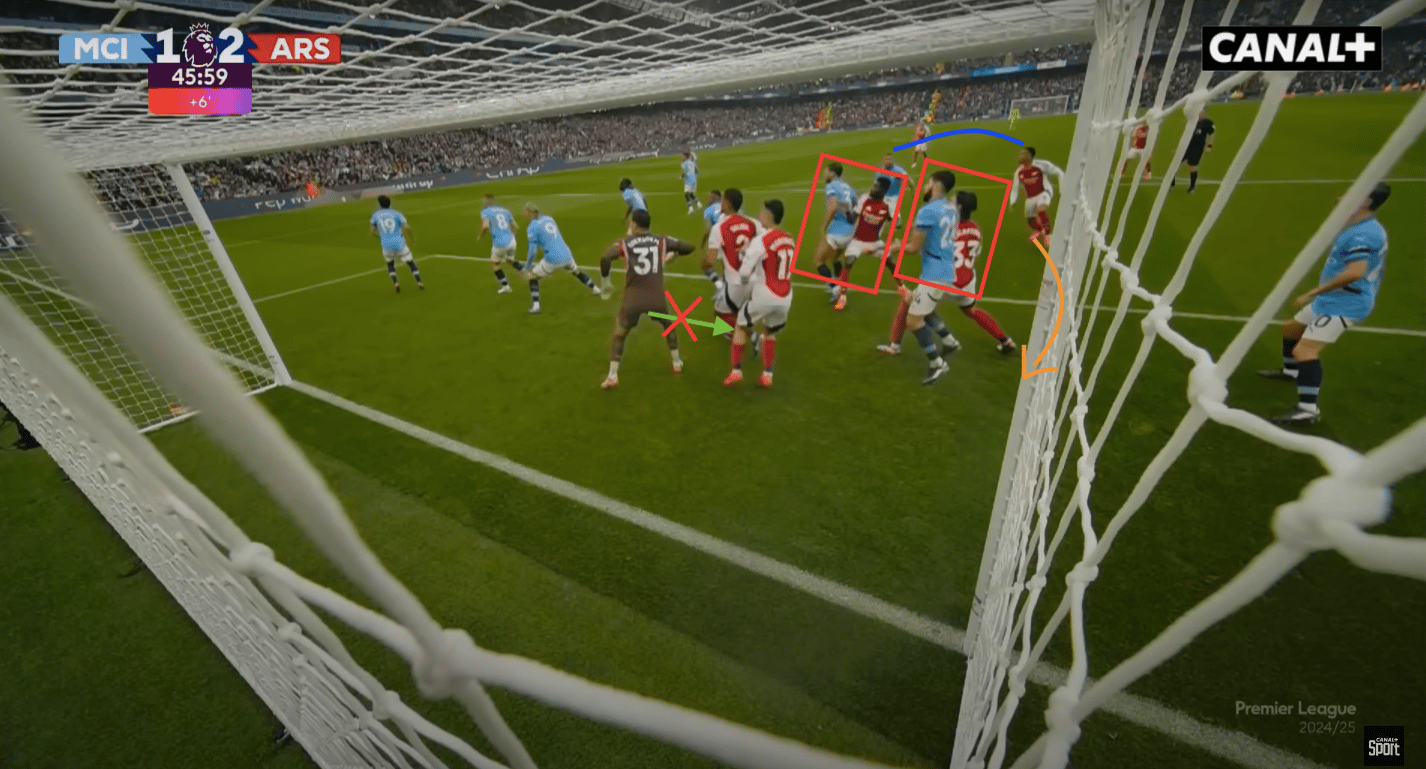 Les 5 joueurs de Man City au premier poteau sont inutiles car le corner sera joué au second.