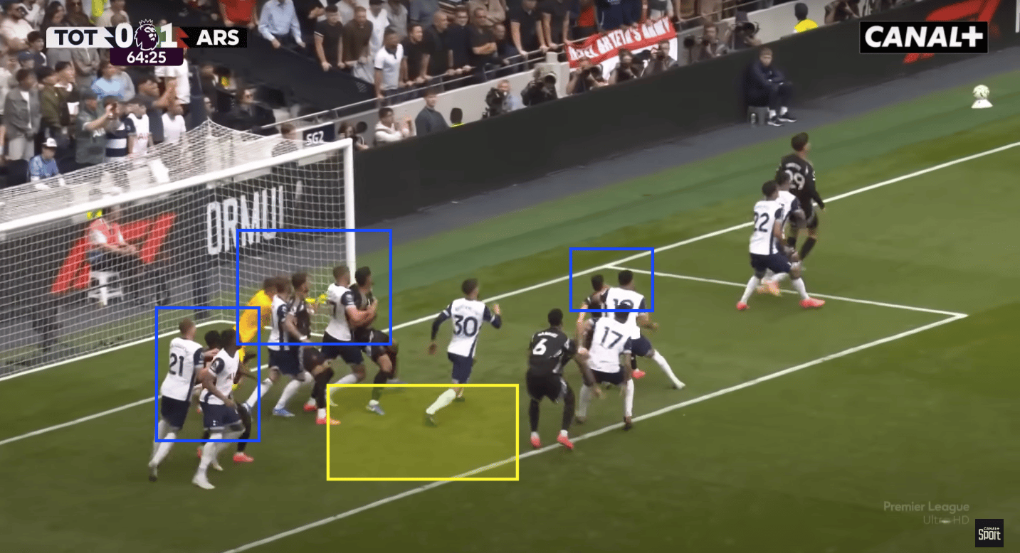Cette fois-ci, les joueurs de Tottenham sont entre leur gardien et les joueurs d’Arsenal. Il est alors impossible de siffler obstruction sur le gardien pour l’arbitre.