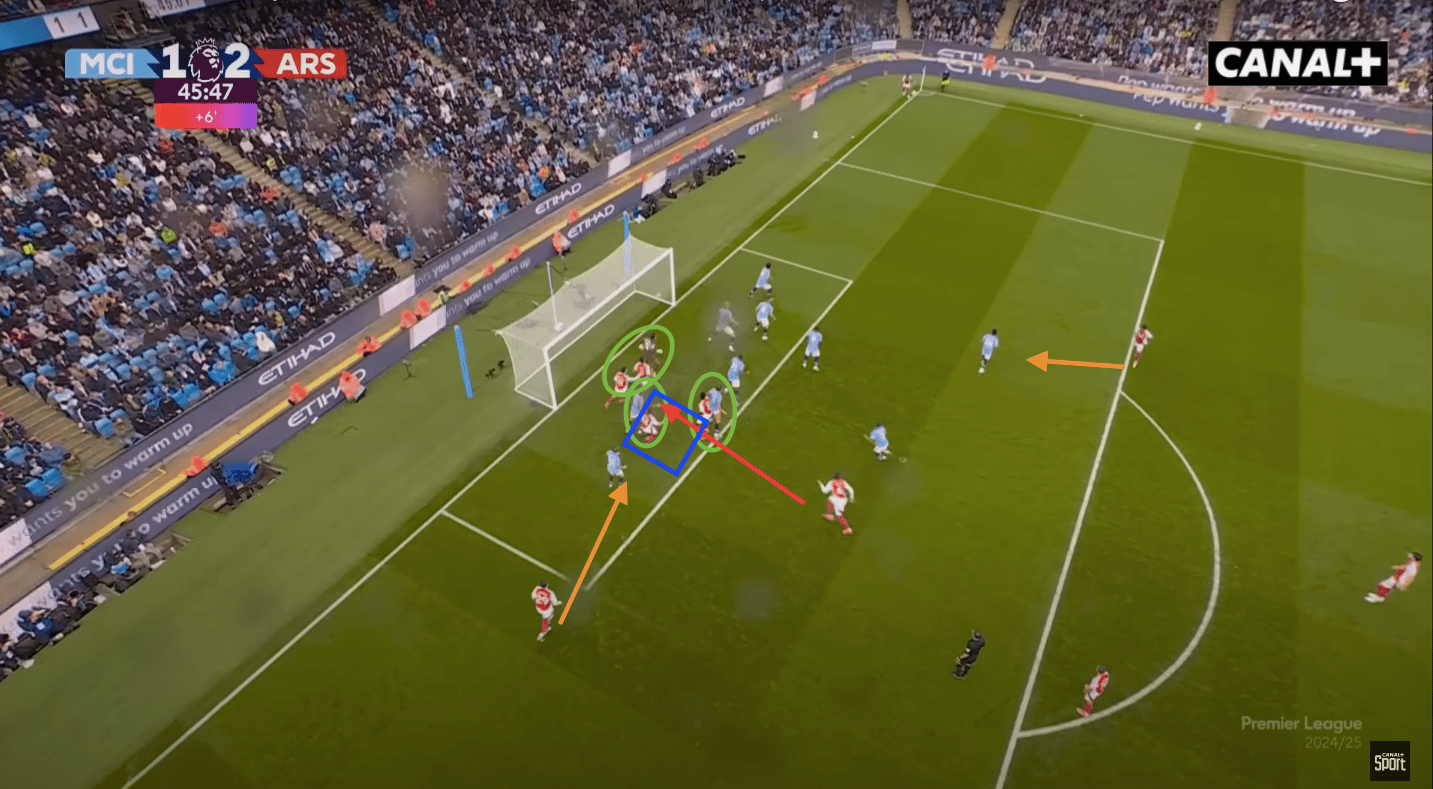 Leur objectif est de faire un bloc, comme on peut le voir au basketball, dans le but d’empêcher les défenseurs de Man City de pouvoir venir défendre dans cette zone (bleu)