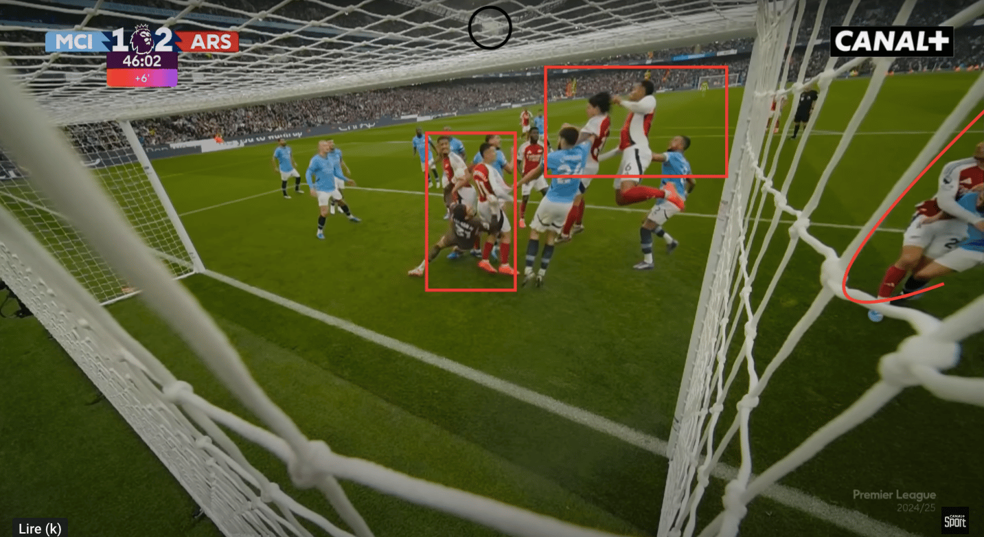 Le receveur, environ 1 mètre derrière le point de penalty. À Arsenal, il s’agit de Gabriel, le meilleur joueur de tête de l’équipe. Dans notre action, il est marqué par Walker.